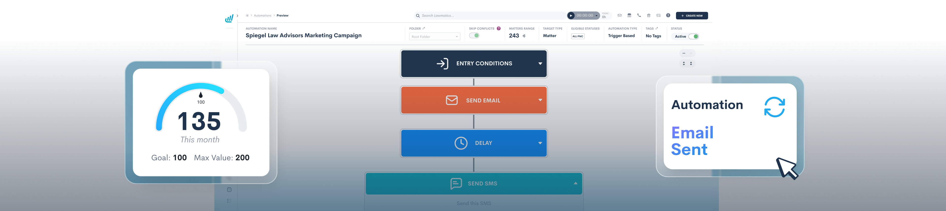You don’t need to be everywhere at once. With Lawmatics, automation in law firms is simple and powerful. Whether you’re re-engaging past clients or nurturing cold leads, our system helps legal professionals stay relevant without adding tasks to your team’s plate. Automate outreach, reminders, and recurring campaigns with the leading software for lawyers.