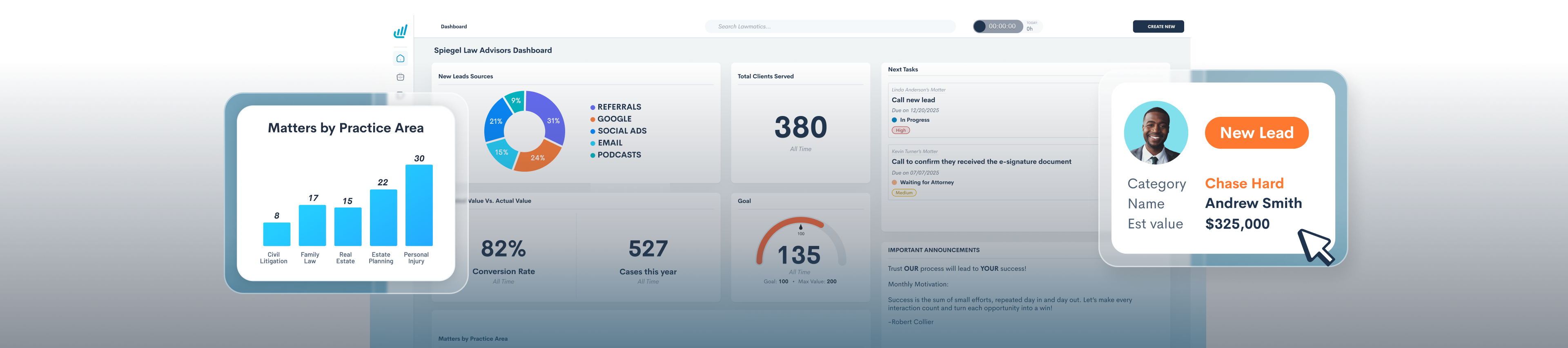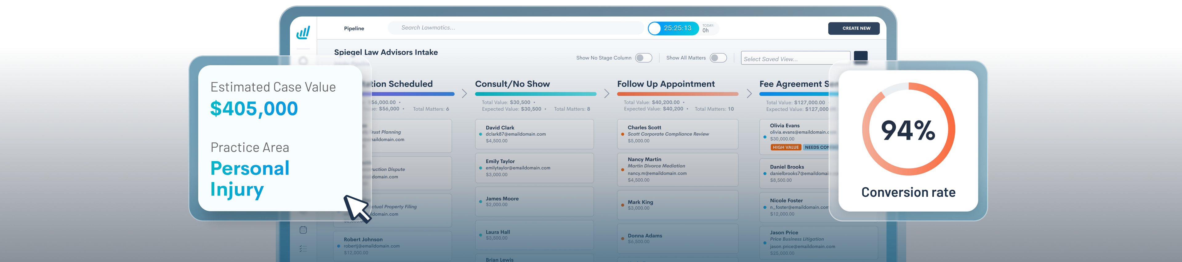 Lawmatics helps you attract, engage, and close new business with purpose. Automate intake, track interest, and turn more inquiries into paying clients — with less lift from your team.