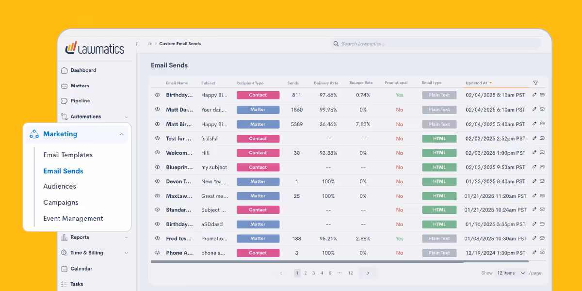 With your emails in motion, the Campaigns tab becomes your control center. Here, you can track performance, tweak messaging based on real-time insights, and optimize engagement. But what happens when an email sparks interest, and a lead wants to learn more? That’s where Event Management comes in. Whether it’s a live webinar, an educational lunch-and-learn, or an in-person networking event, you can manage registrations, track attendees, and follow up afterward. This keeps potential clients engaged and strengthens your connection with them before they even step into your office.By organizing the Marketing tab around the natural flow of client engagement, Lawmatics turns your outreach efforts into a well-oiled machine — attracting, nurturing, and converting leads with ease.