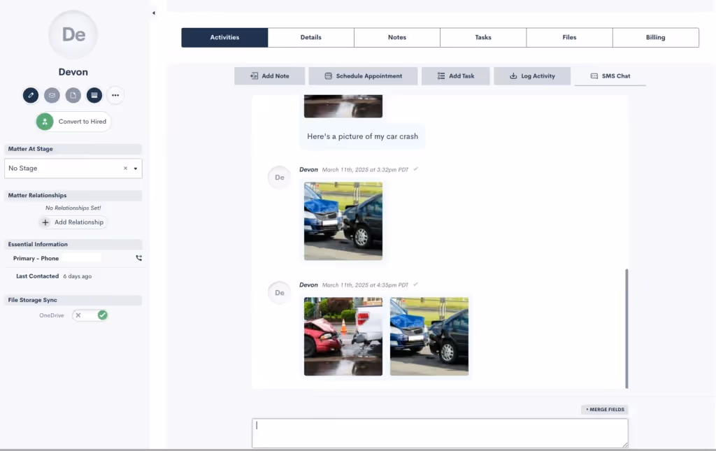While MMS is helpful across the board, in some practice types, the convenience can be a game-changer.Take personal injury, where documentation often includes real-time photos of injuries, accident scenes, or vehicle damage. Now, they can just text it, and you’ll receive it within seconds. And because Lawmatics is SOC 2 Type 2 and HIPAA compliant, your firm can safely receive even sensitive medical or personal records through MMS without worrying about where or how those files are stored.Alternatively, in immigration law, there’s often a long list of required documents: passports, visas, birth certificates, proof of residency, and more. Clients may not have ready access to email or may be coordinating with family members across borders. MMS lets them send what they have on hand right away, without needing a laptop or scanner.Even in estate planning, family law, or criminal defense, there are plenty of moments where a client needs to share a physical document, handwritten note, or piece of mail. With MMS, they can take a photo and send it through the text thread they’re already using to communicate with your firm. It’s easy, intuitive, and completely in line with how they already use their phones.