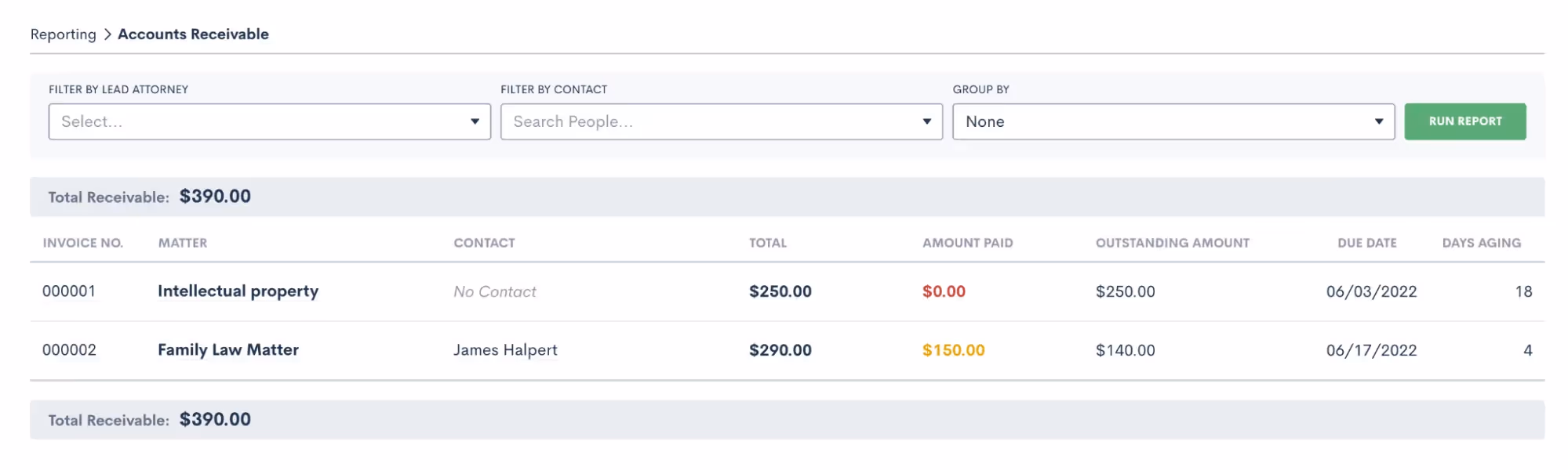 While you can also use custom reporting for reporting on things like leads per practice area or source, the Analytics page gives you a visual breakdown of the same information. This can be great for getting a snapshot view.