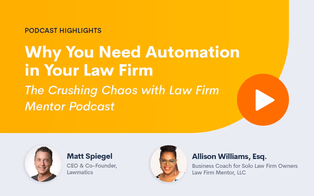Hi, everyone. It's Alison Williams here, your Law Firm mentor. Welcome to another episode of The Crushing Chaos with Law Firm Mentor podcast. Today, I have a special guest for the podcast. His name is Matt Spiegel. Now I'm sure you know who he is even though you may not necessarily know his name because he is someone that I consider to be a big innovator in the legal space. He helps lawyers in a variety of different ways, but the ways that you guys probably know about is practice management software MyCase. He is founder and CEO of MyCase, and he is founder and CEO of Lawmatics.Now, the beautiful thing about bringing Matt to the podcast is that we got to talk about both aspects, practice management software and legal automation. I know that these are two areas where we get a lot of requests. People that reach out to the podcast will say, "Hey, you did a show on such and such or so and so. I'm really interested in learning more." And almost universally, that deals with some form of efficiency tool for our law firms. Because we all know that with each day and each moment that passes more and more data, more and more people come into our orbit, and managing that effectively is what is going to keep us out of the realm of grievances and malpractice suits.So we actually talk about bar grievance and we talked about Matt having had a bar grievance. I personally had one as well. And when people make complaints, it usually is not because they didn't get the result that they wanted. Most clients can intellectually understand that you can't wave a magic wand and get them to a great result, but it's how they felt in the process. And so, how do you get to a better client experience for your customer? How is it that your client can get the star treatment when there are only so many hours in a day?The answer is automation. So Matt and I talk about that, but I want to let you know that Matt is a serial entrepreneur. He is actually a lawyer. He still has his law license. No longer has his law firm, but he was a law firm owner. And through the experience of being a law firm owner, he created the solution that he needed in practice, which was the tool of MyCase, which started off as a client portal, which you're going to hear more about when we speak.He also then founded Lawmatics. After a break from MyCase, he shifted over into the world of legal tech automation, and it's really interesting how he got there. He is somebody who actually is scaling Lawmatics. The way we talk about scaling law firms, he's scaling Lawmatics, it is a venture-backed company, and their approach to automation may be a little bit different than you realize. Something you may or may not have heard before. So you're going to hear it here on the podcast. Check out my talk with Matt Spiegel of Lawmatics. Here you go.All right, Matt Spiegel, welcome to The Crushing Chaos with Law Firm Mentor podcast.