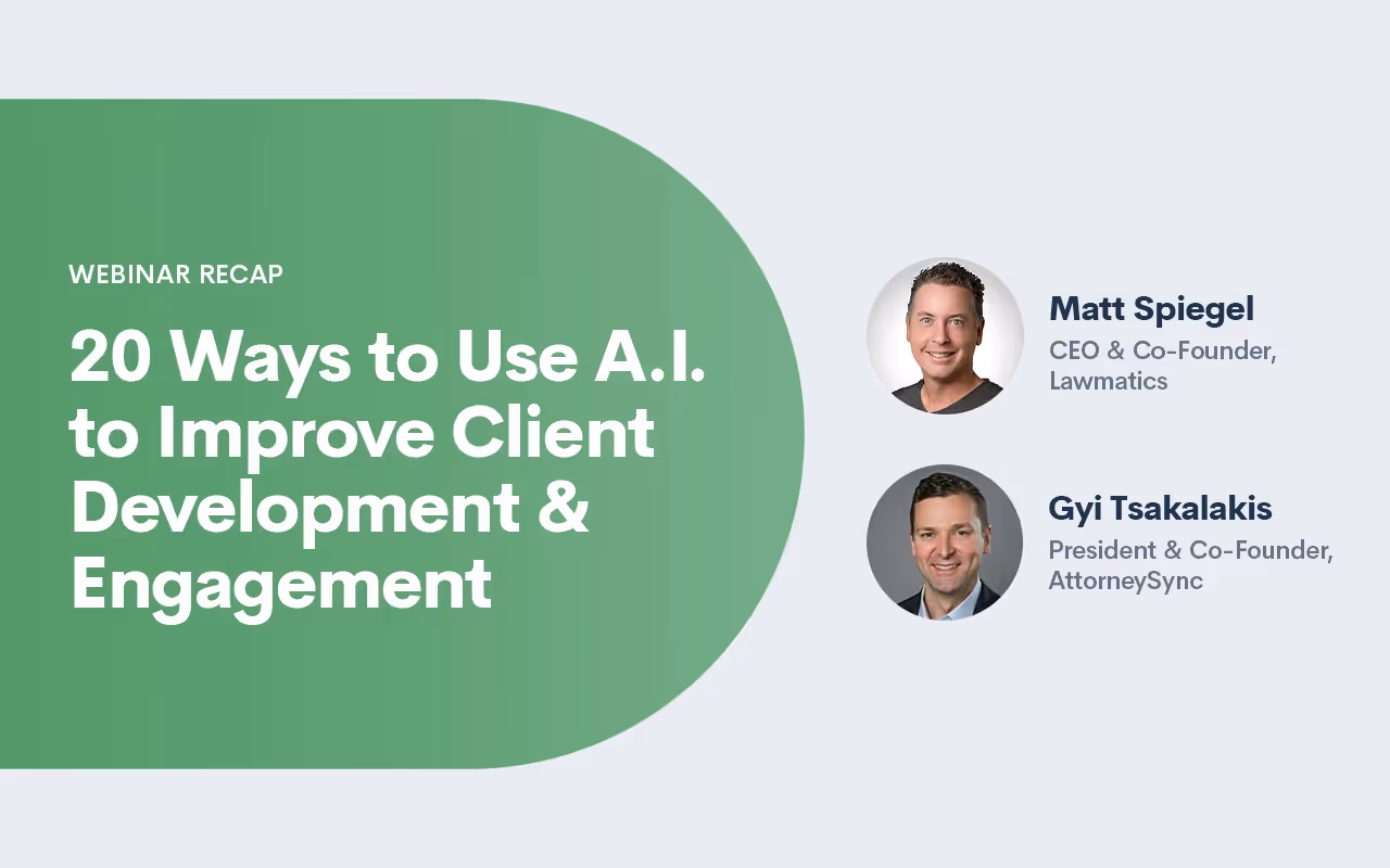 Generative AI can be a transformative tool in the context of legal marketing and client engagement. But it also presents a variety of challenges.In this webinar Lawmatics CEO and Co-Founder Matt Spiegel is joined by Gyi Tsakalakis, President and Co-Founder of AttorneySync. Gyi brings his vast experience leading a digital legal marketing agency to explore 20 innovative ways lawyers can use AI to improve both client development and engagement.