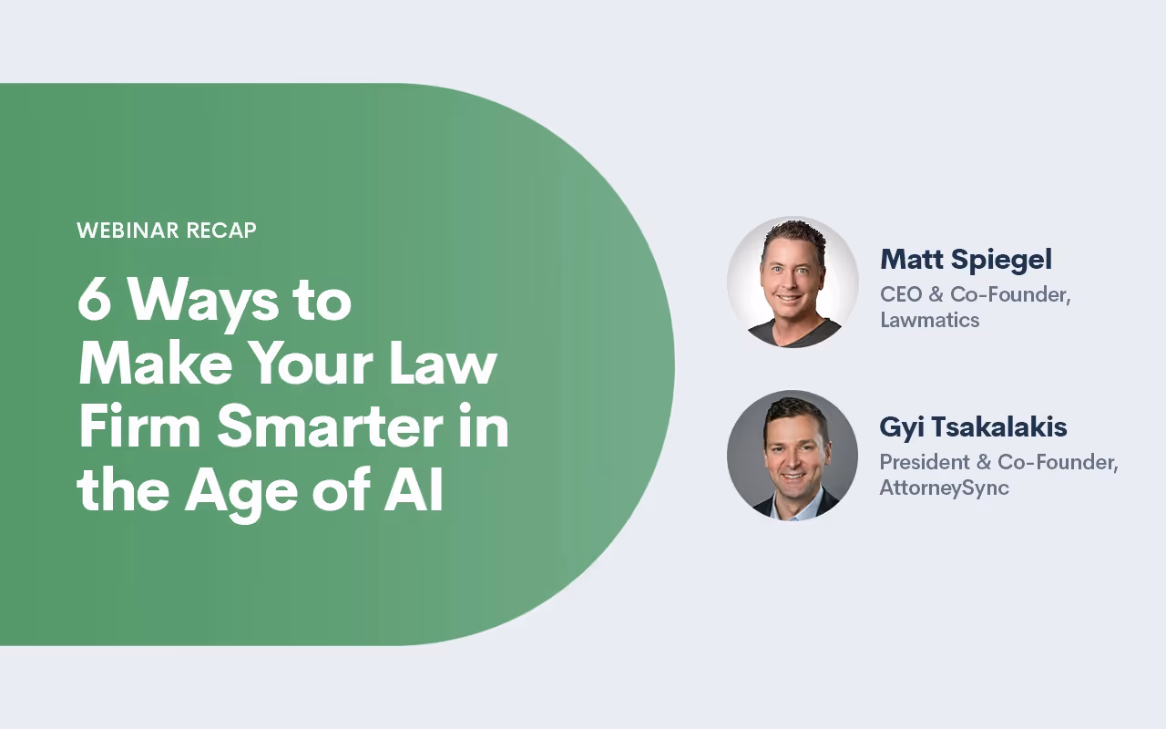 “Armies of Expensive Lawyers, Replaced by Cheaper Software.”This 2011 New York Times headline boldly claimed that expensive lawyers could be replaced by cheaper software. Fast forward to 2023, and we see a more complex picture. Recent studies suggest that nearly 44% of legal work could be automated, yet the demand for human expertise remains strong. The firms that blend automation with human skills are set to dominate the future.In this webinar Lawmatics CEO and Co-Founder Matt Spiegel is joined by Gyi Tsakalakis, President and Co-Founder of AttorneySync. Both Matt and Gyi bring legal backgrounds and entrepreneurial mindsets to discussing the intersection of cutting-edge technology and the legal client experience.