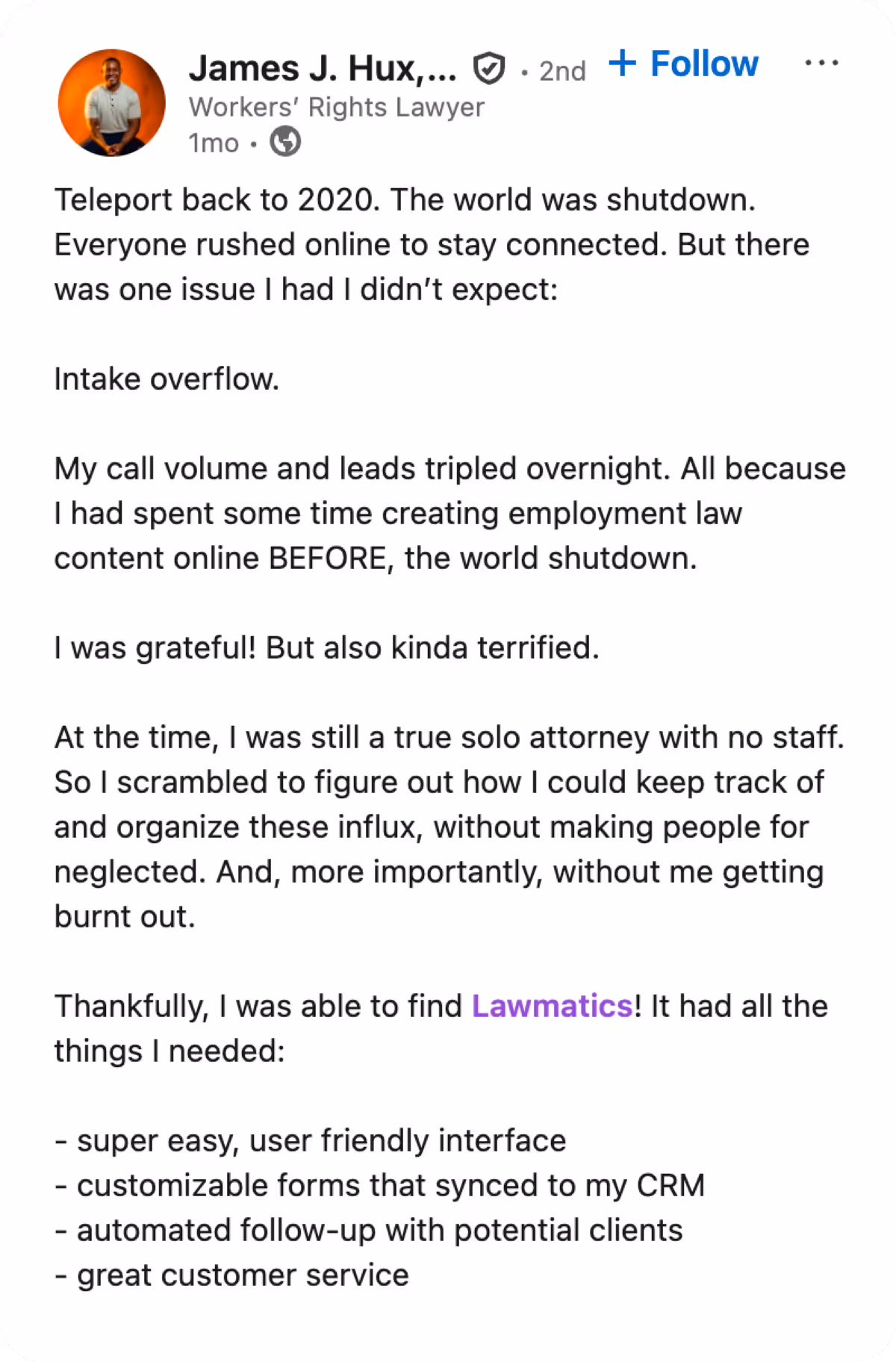 Post about Lawmatics, and send us the link (marketing@lawmatics.com).