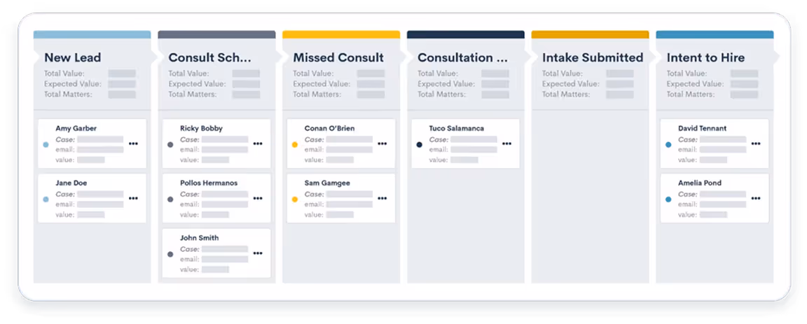 Customizable templates and workflows make it easy to analyze firm-relevant data to see what you need to take action on. From calls to emails, track everything in one place and gain full control of each stage of the client intake process.