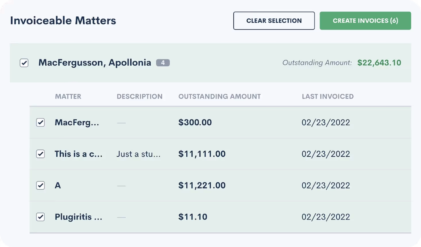 Recurring invoicing, tracking billable hours, matter management, and reporting all seamlessly work together in Lawmatics. All logged time entries on your matters are pulled directly into your invoices as line items, making for easy and on demand legal billing and invoice generation. You can even include line items with details such as fund deductions from trust balances, remaining trust account balances, and more for maximum transparency.